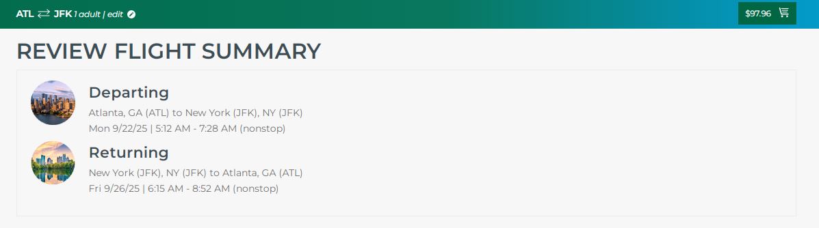 September: Atlanta - New York (with return) from $97 with Frontier