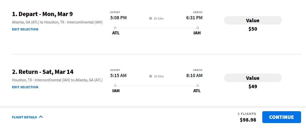 March: Atlanta - Houston (with return) from $99 with Spirit Airlines