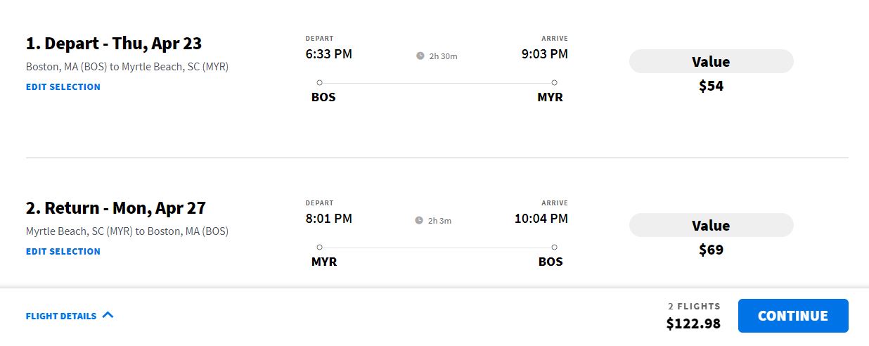 April: Boston - Myrtle Beach (with return) from $123 with Spirit Airlines