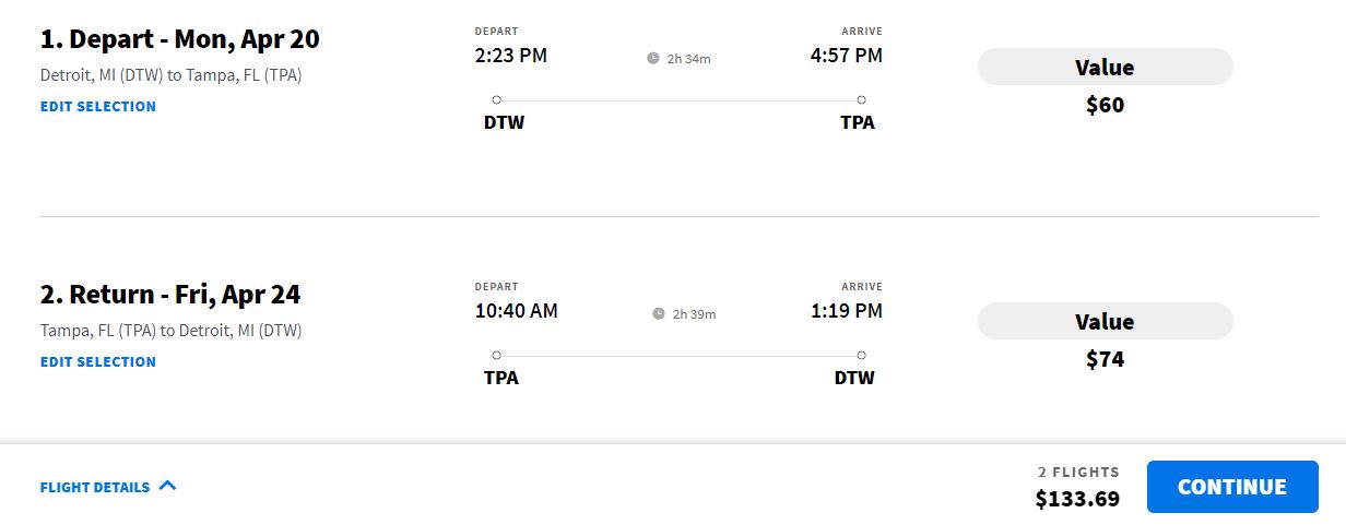 April: Detroit - Tampa (with return) from $133 with Spirit Airlines